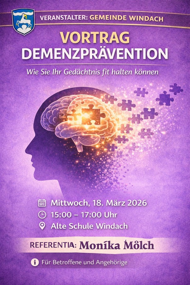 Vortrag Demenzprävention + Zu Google Kalender hinzufügen + iCal / Outlook export Datum 18.März.2026 Uhrzeit 15:00 - 17:00 Veranstaltungsort Alte Schule Raiffeisenweg Kategorie Vorträge Veranstalter Gemeinde Windach Telefon 08193-9305-22 E-Mail michl@vg-windach.de Website https://windach.de/